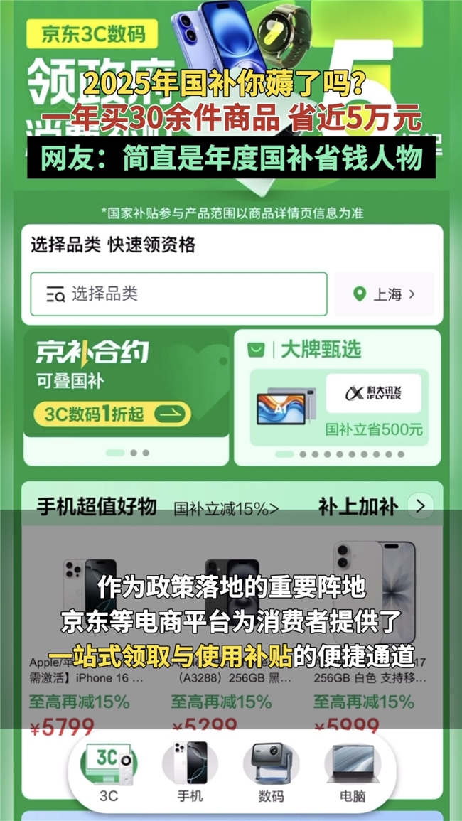 正文:近期,一份关于国家补贴政策(以下简称“国补”)的消费趋势观察引发关注:通过梳理公开数据发现,国补政策在耐用消费品领域为消费者带来显著的支出减免。据梨视频报道,一位来自上海的消费者一年内在京东购买家电、3C数码及家装产品,在国补的支持下累计节省近5万元,相当于一辆小汽车的支出,被网友称为“年度国补省钱人物”。