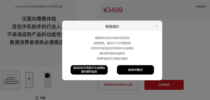 中兴通讯官网公开信息显示,努比亚M153搭载了骁龙8至尊版移动平台,目前处于“售罄”状态。想要体验的朋友可添加豆包手机助手企业微信填写预约信息申请F码,获得F码后可以按提示购买。