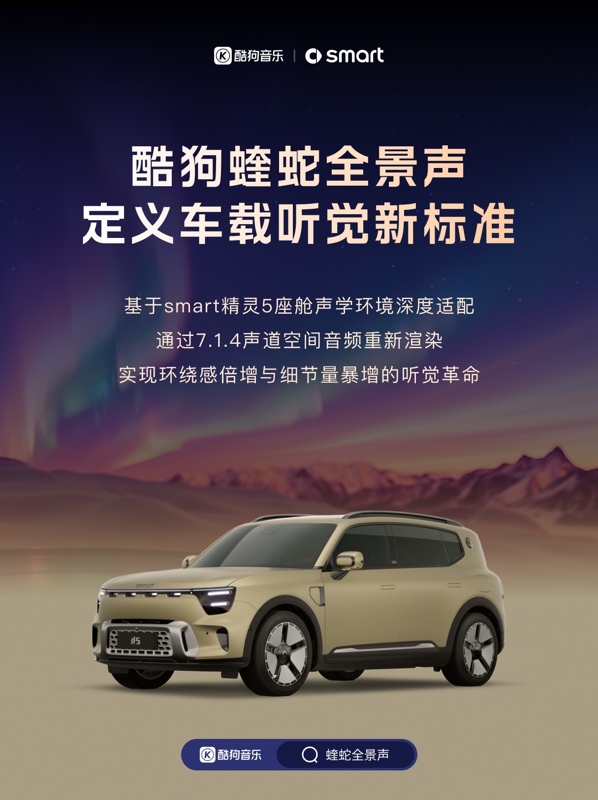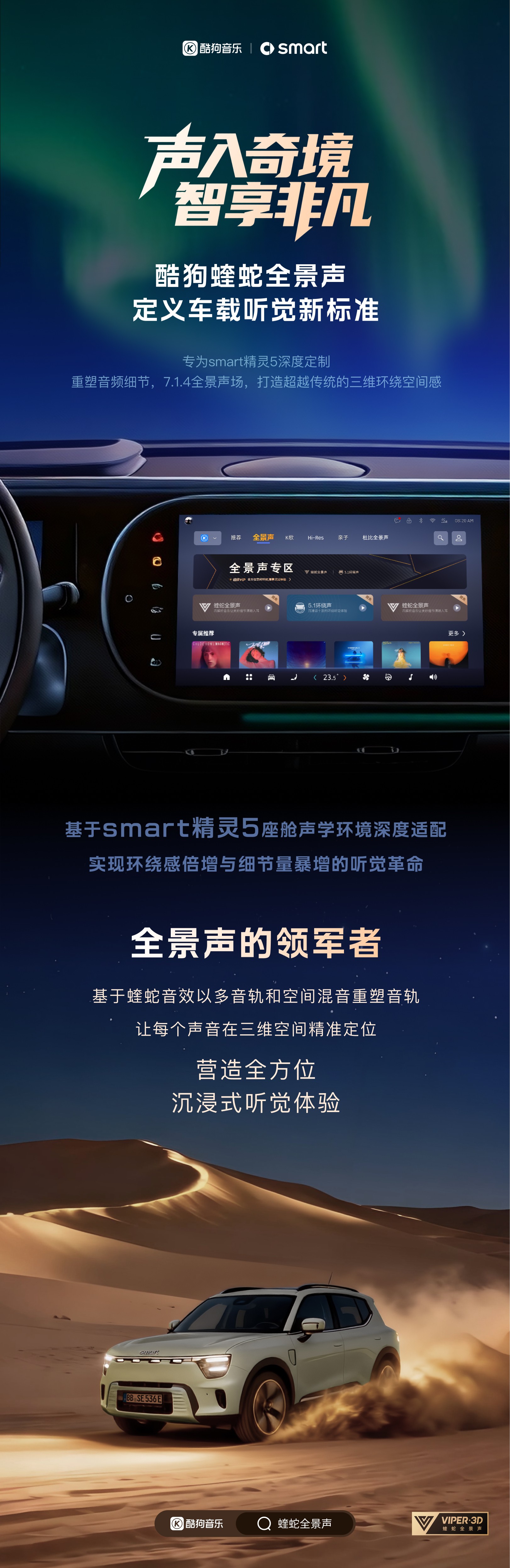 正文:近日,酷狗音乐与smart达成一项新合作,酷狗音乐上线专为smart精灵5号深度定制的蝰蛇全景声,定义车载听觉新标准。此次全新发布的酷狗蝰蛇全景声,重塑音频细节,以7.1.4全景声场,打造超越传统的三维环绕空间感,带来身临其境的听觉盛宴。