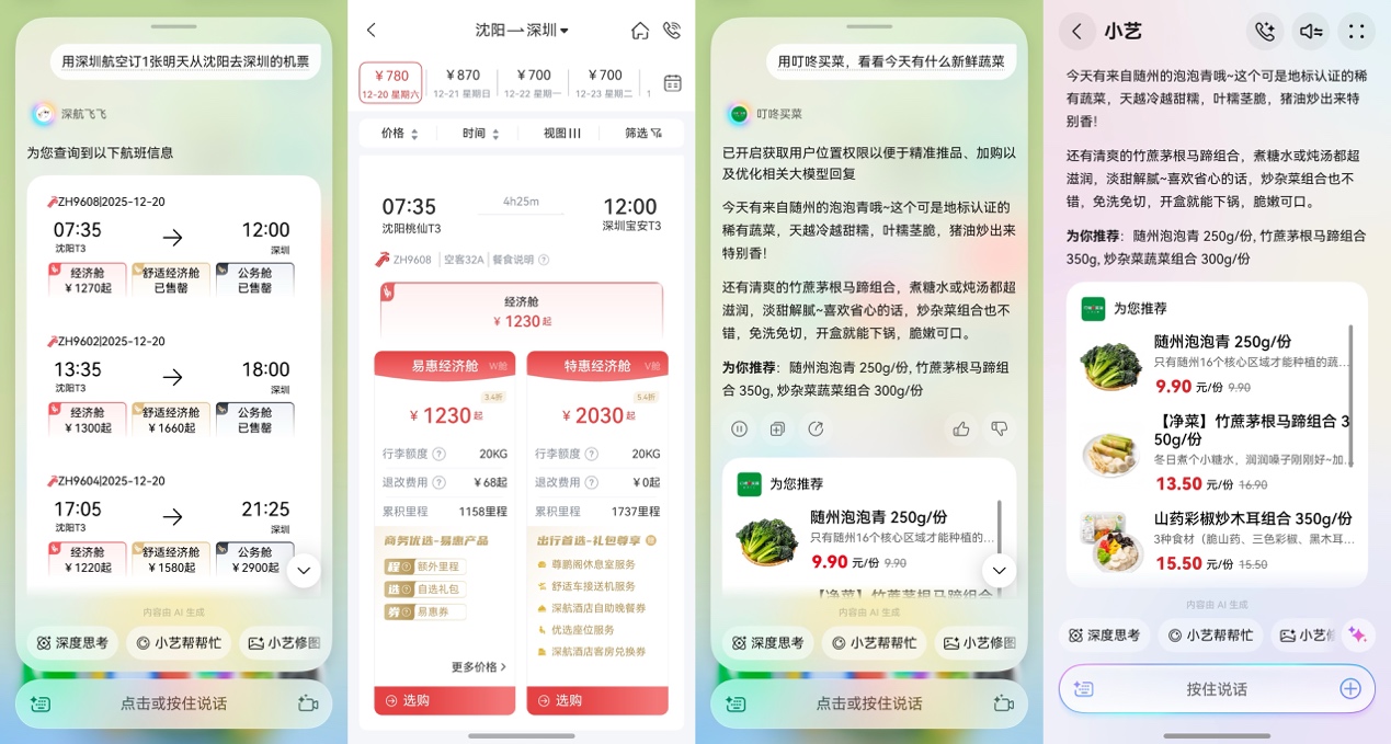 对于小艺智能体荣获“开口就有奖”,我举双手认同!因为平时我用小艺的频率非常高,比如明天需要出差,我只需唤醒小艺,说一句“用深圳航空订一张明天从沈阳到深圳的机票”,它就会立刻调度深航飞飞智能体,快速完成订票。周末做饭时,我只要对小艺说“用叮咚买菜看看今天有什么新鲜蔬菜”,叮咚买菜智能体就会结合时令推荐食谱和菜品。这种“张嘴就能办”的体验,让生活琐事变得更从容,真正实现了一句话搞定日常。