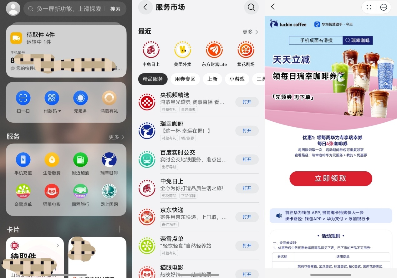 自从用惯了HarmonyOS 6的华为负一屏,我的手机桌面清爽了不止亿点点。中午想点外卖?手机桌面右滑进入负一屏,点击美团外卖元服务就能下单。下午犯困咖啡续命?瑞幸咖啡元服务一键点单,还有鸿蒙专属优惠。周末准备看电影?用猫眼电影元服务快速选座、订票...即点即用,用完即走,真的是旦用难回。