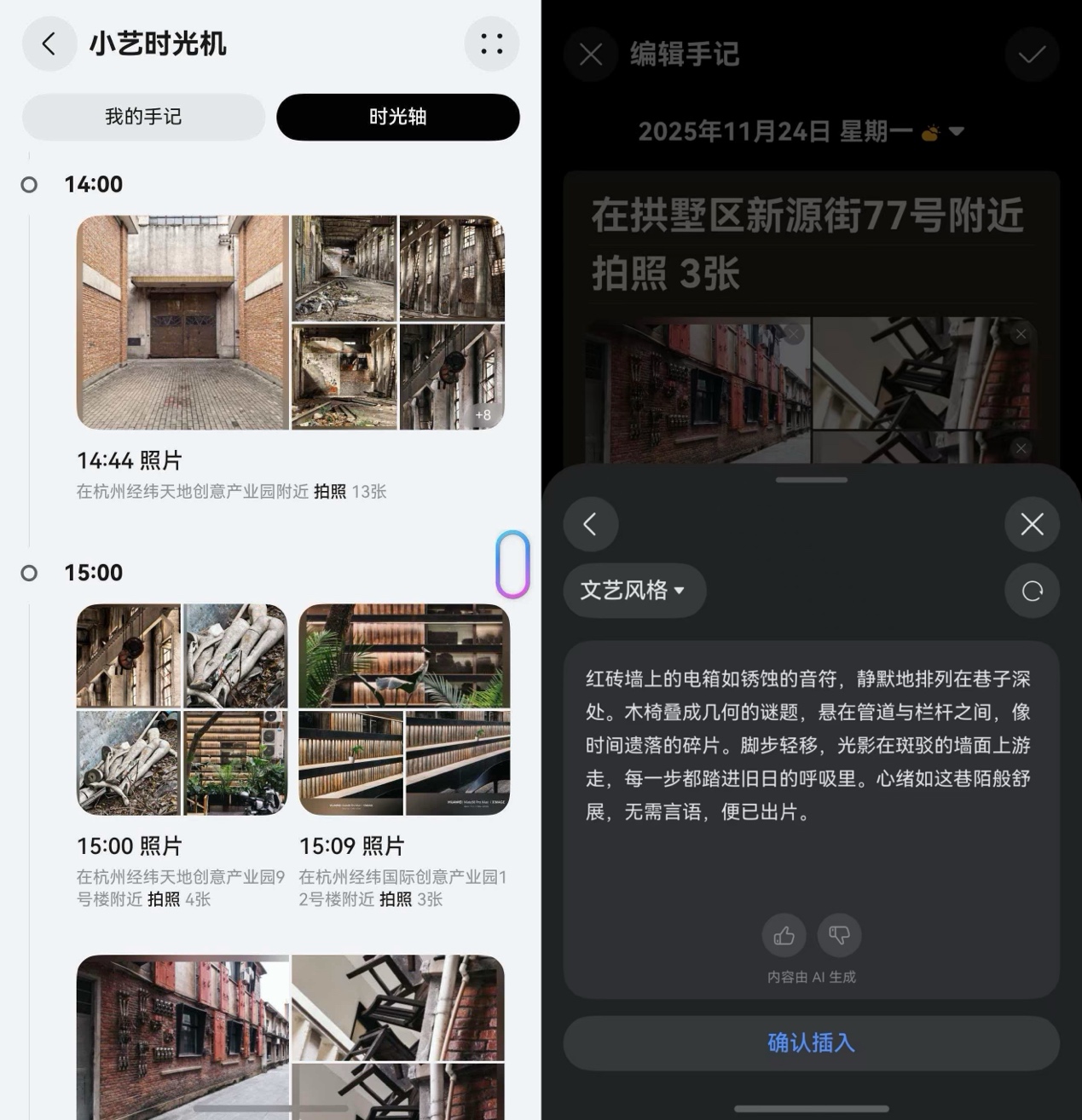 如果说“小艺方言自由说”功能照顾了家人的语言习惯,那“小艺时光机”就是为我这样的懒人准备的记忆管家,让每一次出行都有迹可循,出游快乐再加倍。上个月我去旅游,拍了一堆照片,回来也一直放着没整理。没想到过两天,小艺时光机居然给我生成了一个时间轴,把我拍的照片、去过的地方定位,甚至当时的天气信息都自动整合在了一起。虽然只是个时间线,但帮我串联起了所有碎片记忆,我只需要在此基础上补充点心情文字,一份像样的游记就出来了。