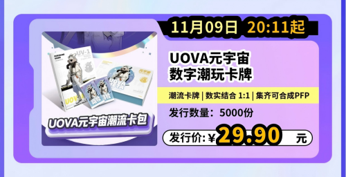 11分钟后,“UOVAMETA元宇宙数字潮玩卡牌”将正式解锁。用户不仅可以获得UOVAMETA限量实体潮流卡包,还能免费解锁对应数字资产,实体收藏、数字权益一次购物双倍满足。数字资产可通过“UOVABOX”平台领取,提升数字资产增值空间。该卡片限量发行5000份,售完即止,收藏价值倍增。