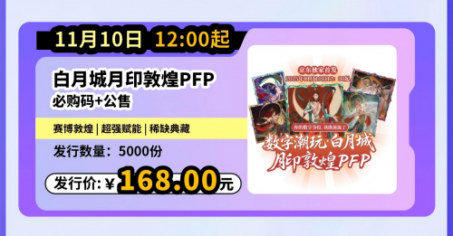 11月10日12:00,白月城和敦煌文创联合推出的PFP数字藏品“丝路苍穹·月印敦煌”将在京东率先发售。该系列以敦煌莫高窟中壁画为创作灵感,融汇飞天的飘逸之姿、藻井的华美纹饰与乐器的流转韵律,结合现代数字艺术表现手法,实现传统文化精神的当代转译。每一件作品不仅是千年文明的数字延续,也是契合现代审美的艺术新表达。