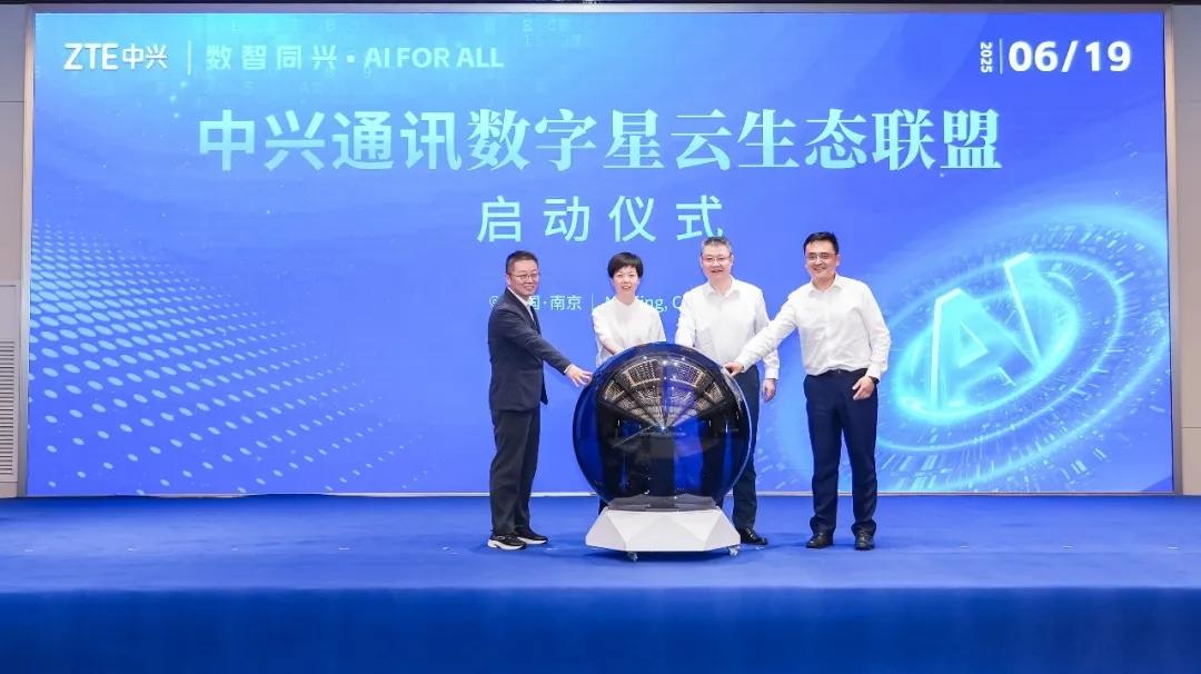 南京市副市长蒋敏(左二)亲临大会现场,与中兴通讯高级副总裁王翔(右二)等人共同启动中兴通讯数字星云生态联盟,该联盟旨在整合各方资源,通过标准化协作机制推动技术成果转化,为南京乃至全国数字经济产业发展注入新动能。