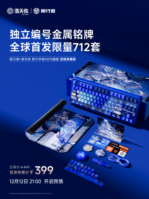 近日,国产外设领军品牌前行者(EWEADN)正式宣布,其与虚拟歌姬洛天依深度联名的前行者X洛天依X87s歌行宇宙主题机械键盘(日常售价499元,首发特惠399元)将于12月12日在各大电商平台同步开启预售。这不仅是一款新品的发售,更是技术、文化与情感三者融合的具象化表达,是一次面向未来的“情绪伙伴”邀约。