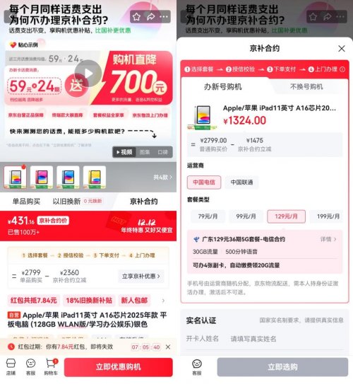 希望优惠换新3C数码产品,又希望话费、流量可以实现家庭共享,可通过“京补合约”入手大疆 DJI Osmo Pocket 3 标准版、iPad 11英寸 A16芯片2025年款等好物。以iPad 11英寸 A16芯片2025年款 128GB WLAN版 银色为例,广东消费者办理当地电信129元36期套餐,享京补合约立减1475元,到手价1324元,套餐含30GB流量和500分钟语音,可办4张副卡,自动缴费领20GB流量,适合家庭使用。