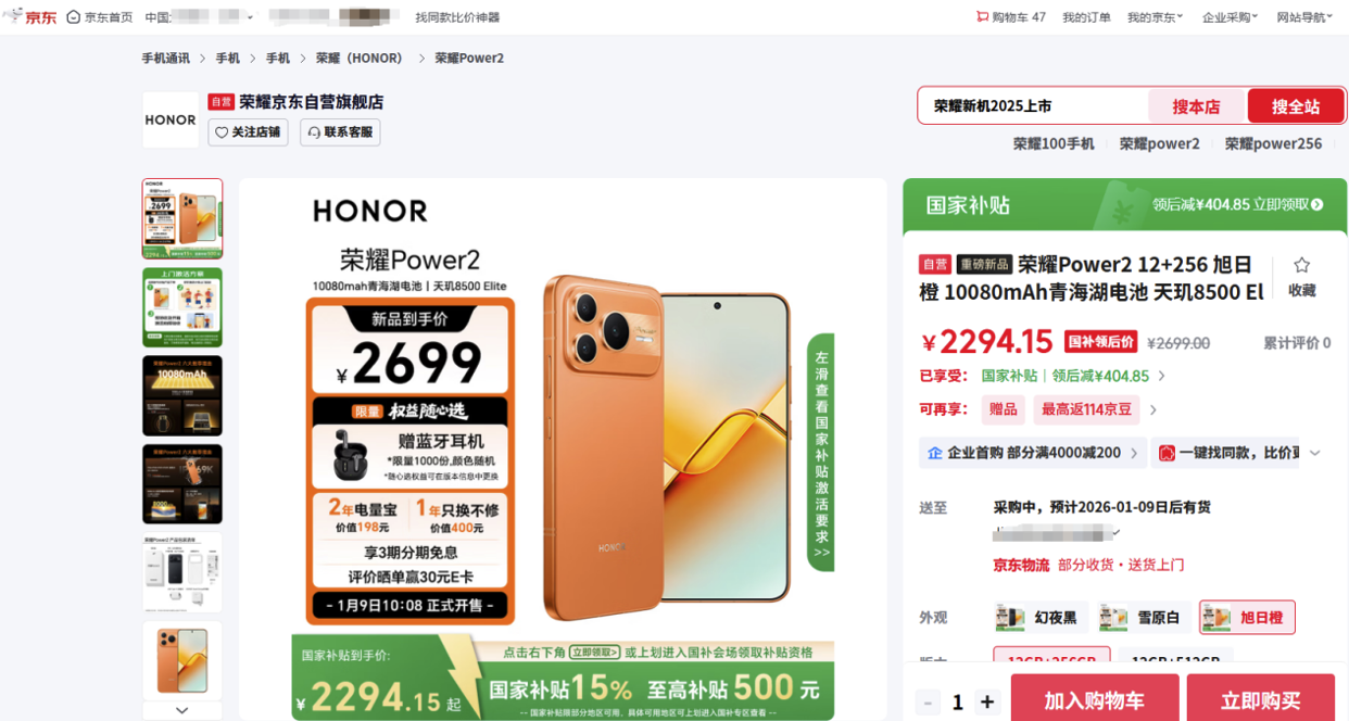 2294元起!来京东先人一步下单荣耀Power2享国补立减15%