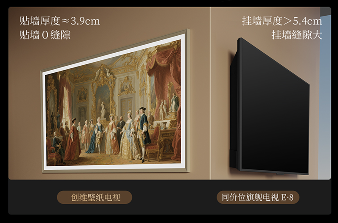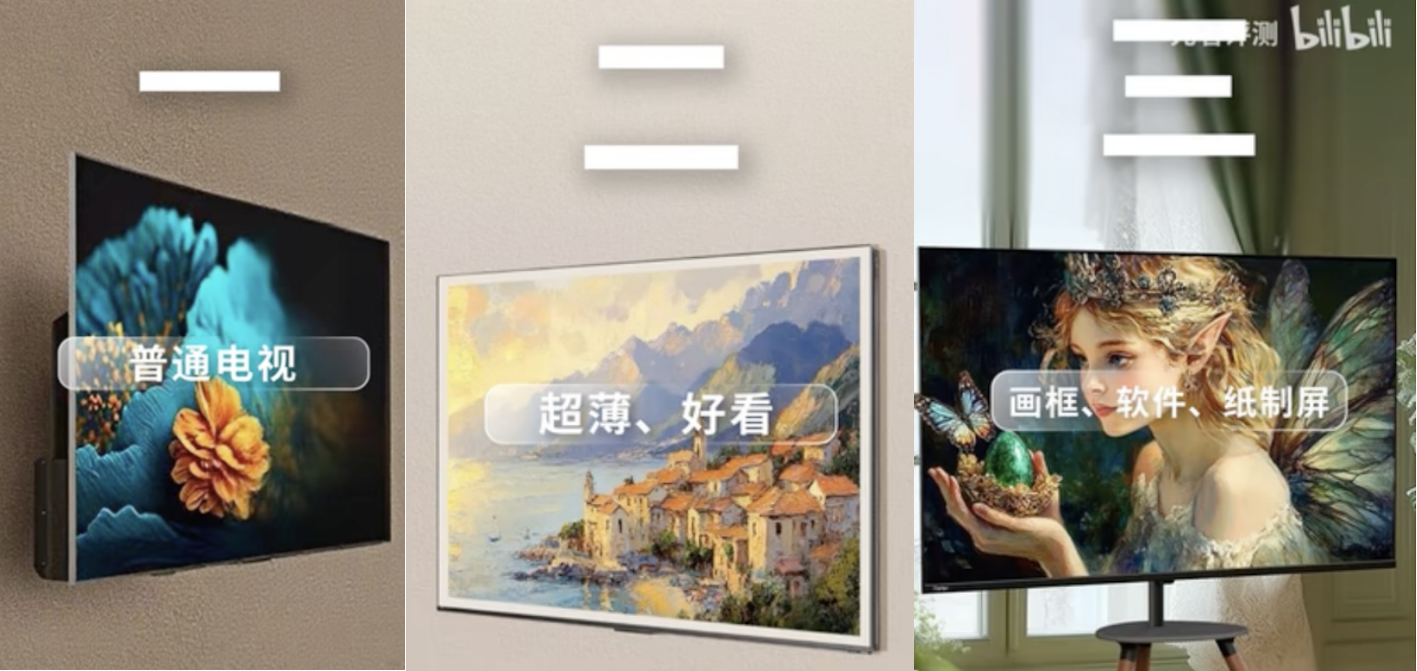 「先看评测」认为,目前市面上的壁纸电视大致分为几类:有的只是加了个“壁纸电视”的名头,本质与普通电视无异;有的则是集超薄机身+定制画框+类纸屏+壁纸软件于一身的产品,很明显,后者才是真正意义上的壁纸电视。