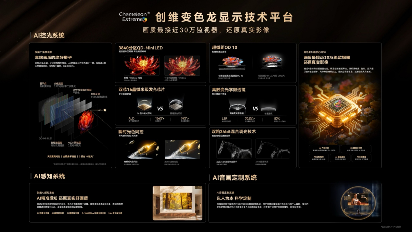能拥有如此高的画质表现,创维“变色龙显示技术平台”中的AI控光系统功不可没。其具备的多项核心技术,让大家在观看时能够明显感知到亮度提升、色彩过渡更自然,清晰度、对比度和层次感超越以往,画质对标30万元好莱坞监视器。