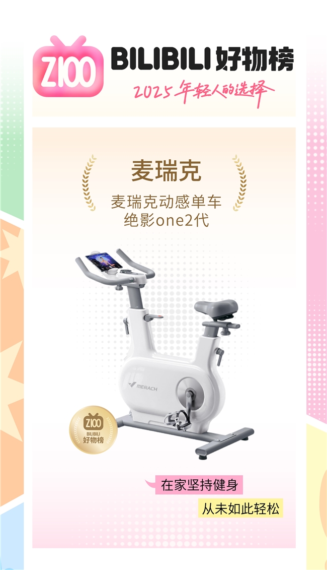 正文:近日,2025年Z100 BILIBILI好物榜正式公布,麦瑞克动感单车绝影one 2代凭借B站大数据平台哔哩指数(Z-Index)评定的高站内热度与强用户心智影响力,成功入选“2025年轻人的选择”榜单,这亦是麦瑞克继2025年双11、双12包揽天猫、京东动感单车类目销量榜首后,在家用健身器材领域头部地位的又一有力佐证。