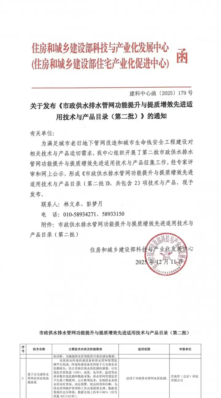 近日,住房和城乡建设部科技与产业化发展中心正式发布《市政供水排水管网功能提升与提质增效先进适用技术与产品目录(第二批)》。芯视界(北京)科技有限公司凭借其自主创新的 “量子点光谱排水管网水质在线监测系统” 成功入选,标志着该技术在推动城市排水管网治理现代化、数智化方面获得国家层面的高度认可,将为我国城市水环境治理与管网运维提供强有力的科技支撑。