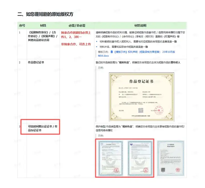01短剧/漫剧官方指南已写明:可信时间戳成指定“上传材料”
