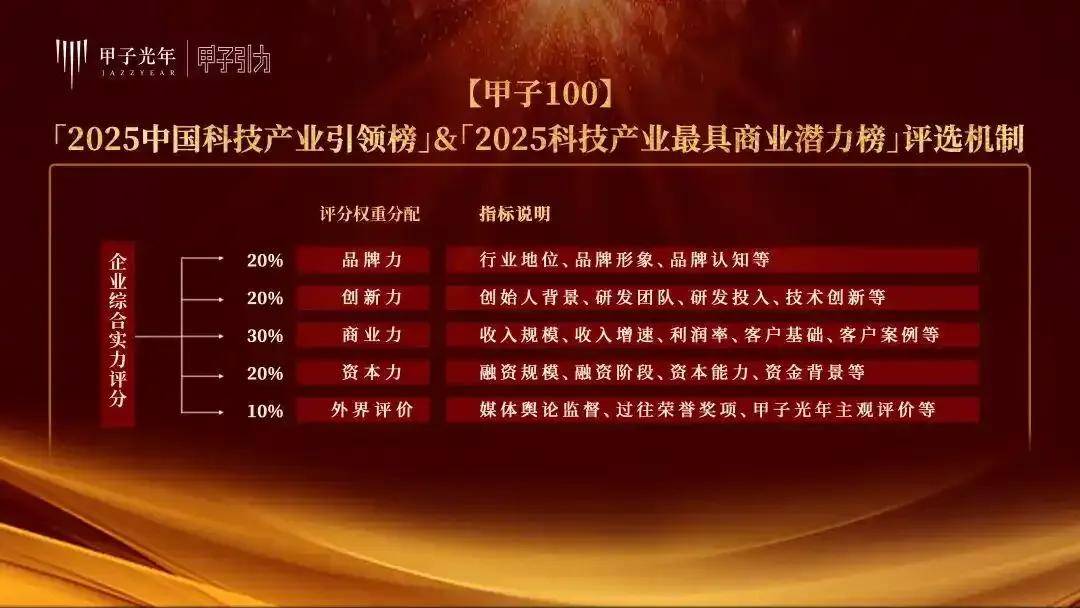 甲子光年榜单评选以严苛、专业著称,采用五维综合评估体系:创新力占20%权重,重点考察技术深度与研发投入;商业力占30%,聚焦营收质量与客户落地;品牌力占20%,评估行业地位与市场认知;资本力占20%,衡量融资能力与资金效率;外界评价占10%,综合媒体舆论与荣誉认证。