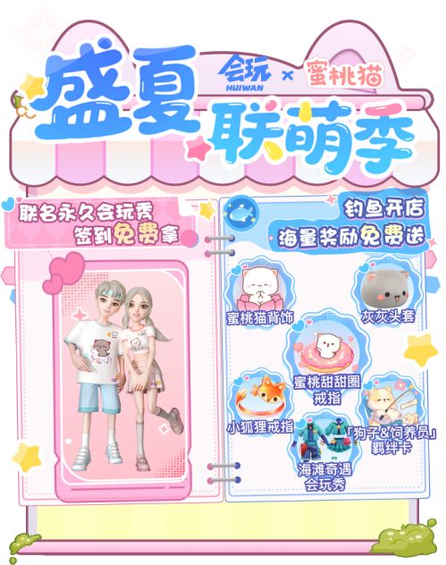 为回馈广大玩家,会玩App同步上线签到福利活动。玩家每日登陆即可免费领取蜜桃猫联名的会玩秀·恋恋蜜桃、鱼竿皮肤、表情包等限定虚拟道具。更有机会额外开启趣味耳饰、联名语音动画和大量蜜桃币,轻松提升萌力值,尽享夏日活力。