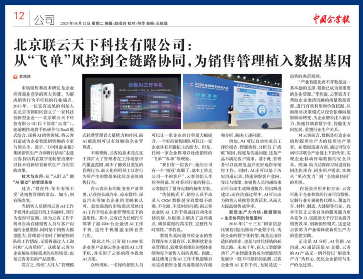 中国企业报专题报道云客,称其“富有远见地将手机硬件与SaaS模式相结合,深耕AI销售领域,成为企业智能销售领域的专家和领头羊”