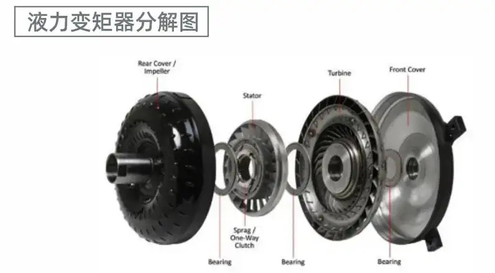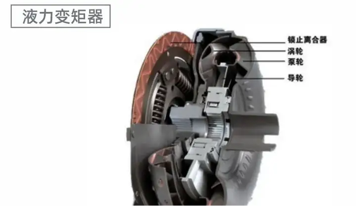 和手动挡汽车不同,自动挡汽车的发动机和变速箱之间没有传统意义上的离合器,取而代之的是液力变矩器,它是液力传动部件的一种,由泵轮、涡轮和导向轮组成。泵轮同主动轴相连,能把主动轴输入的机械能依靠离心力的作用转换成液体的动能和压头,供涡轮做功之用。涡轮和从动轴相连,能把液体的动能和压头所含的能量由从动轴输出。