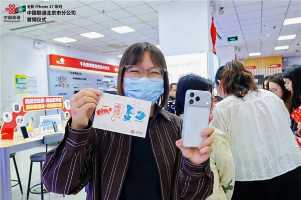 活动现场人潮涌动,气氛热烈。以联通IP“通通”为主题打造的拍照打卡墙,吸引了大量用户驻足互动。近百人参与趣味集章任务,领取限量定制卡片,并通过购机抽奖获得独家纪念品,纷纷留下与iPhone 17的首张珍贵合影。活动还通过线上线下多元联动,以沉浸式体验全面展现iPhone 17的卓越性能与联通的业务优势。