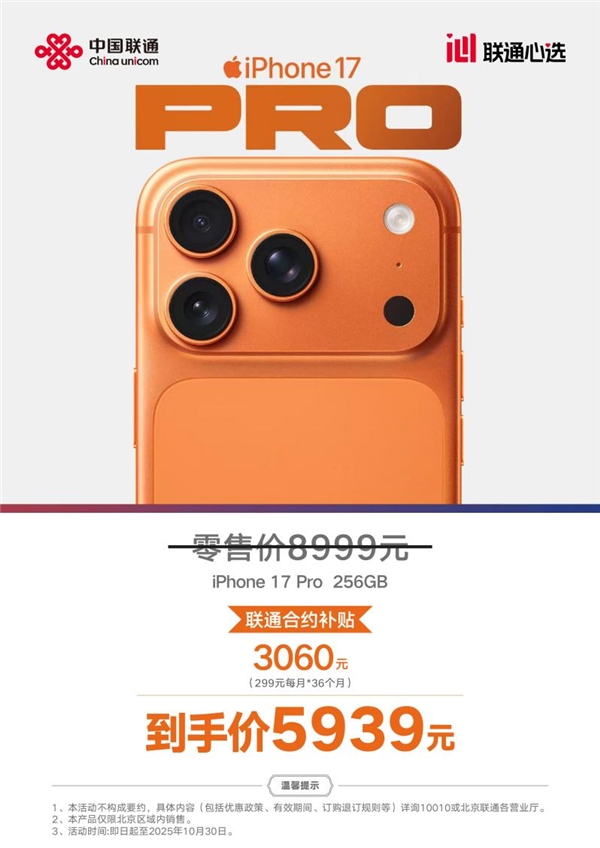 现在办理北京联通臻宽带套餐并购买iPhone 17系列新机,即可享受合约直降3060元的专属优惠,到手价仅需5939元。(注:本活动不构成要约,更多优惠详情请咨询10010或北京联通各营业厅)。此外,北京联通还提供免费到厅贴膜、手机数据迁移等贴心服务,全面提升消费者购机与使用体验。