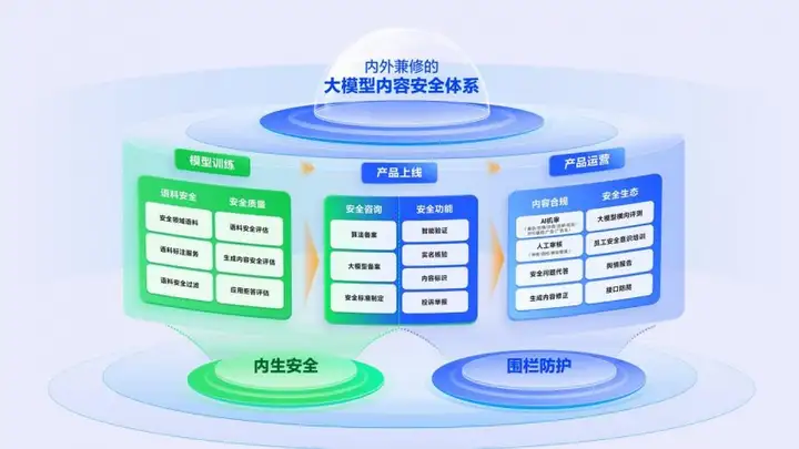 围栏防护,给AI应用穿上铠甲。贯穿产品上线与运营全程,产品上线时提供安全咨询与功能服务,如算法备案、智能验证、大模型备案、实名核验、安全标准制定、内容标识、投诉举报等;产品运营时确保内容合规,开展大模型横向评测、人工审核、安全问题代答等工作,同时构建安全生态,进行员工安全意识培训、舆情报告与接口防爬。二者结合全方位保障大模型内容安全。