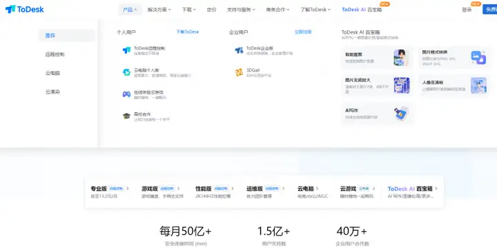 ToDesk通过这五大产品线,构建了一个全面覆盖远程办公场景的完整生态系统。远程控制个人版满足了普通用户的基本远程控制需求;远程控制企业版针对企业用户增加了管理和安全特性;云电脑提供了强大的云端算力支持;AI百宝箱集成了多种智能办公工具;渲骋则是专门为3D应用提供云端渲染解决方案。