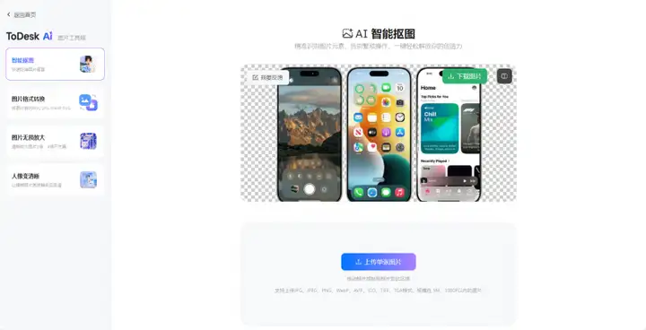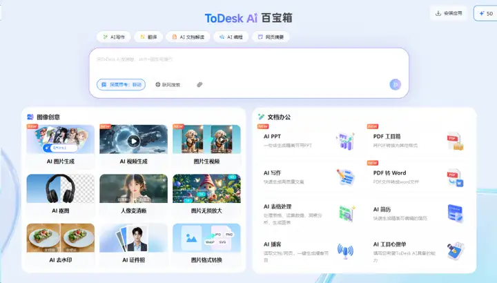 ToDesk AI百宝箱可以理解为是一款AI工具和办公绘图工具箱的集合平台。主要功能包括智能抠图、图片格式转换、图片无损放大、人像变清晰、AI图片创作、AI视频生成、AI PPT、PDF工具箱、AI写作、翻译等。