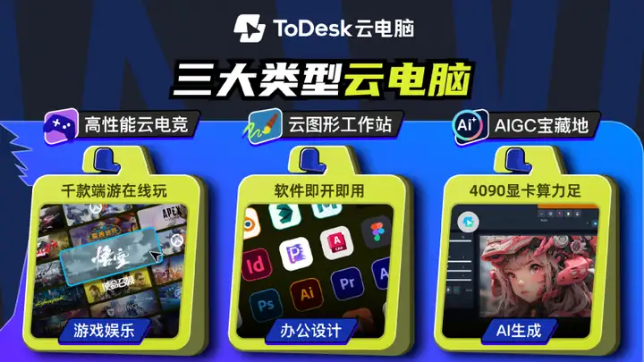 ToDesk云电脑是一款基于云计算技术的电脑使用服务,用户只需通过网络连接,即可随时随地访问和使用云电脑的各种功能,无需担心没有电脑可连用或者本地设备性能不足的问题。云电脑主要提供三种配置类型,分别是高性能云电竞、云图形工作站以及AIGC宝藏地,分别针对游戏、设计和AI领域的需求。
