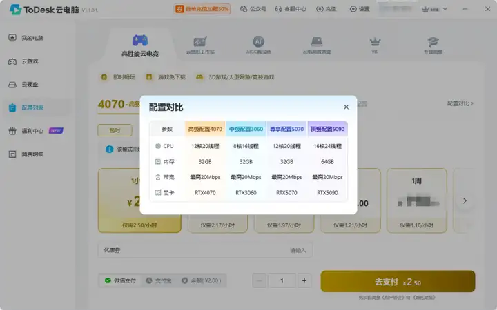 配置方面,云电脑提供显卡RTX3060/4070/4090/5070/5090、CPU8核16线程/12核20线程/16核24线程、内存32GB/64GB,系统盘容量240GB-1TB等多种选择。在这种强大配置的加持下,几乎任何软件都能流畅、快速稳定的运行,并且海量的游戏及常见应用均已预选部署在其中,可做到即开即用,方便省力。