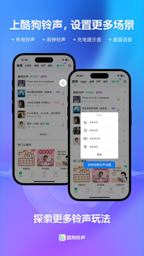 此外,新版本酷狗铃声还拥有多款趣味桌面小组件,以及视频闹钟、充电提示音、精美壁纸等,带来多元化、个性化使用体验。