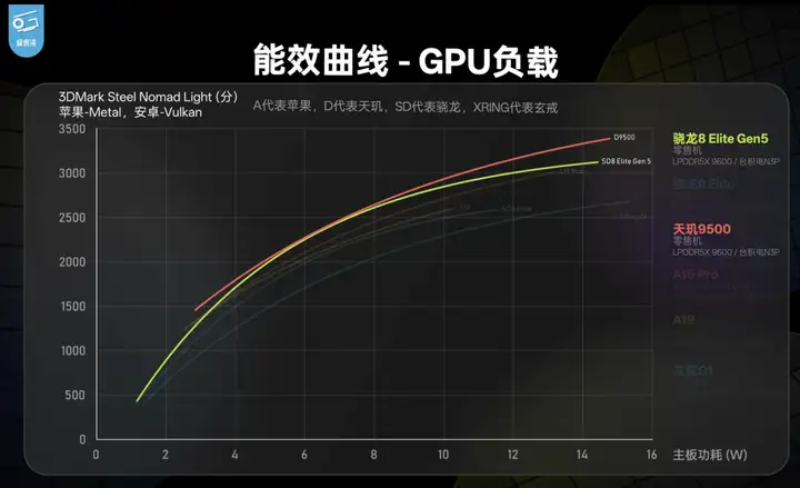 是骡子是马拉出来溜溜,在极客湾的 GPU 能效曲线中,天玑 9500 的零售机再次一骑绝尘,在 3Dmark Steel Nomad Light 实测中不仅性能最强,能效曲线也是全段压着当代所有旗舰零售机。看过最近两年评测的都知道,GPU这样给力的表现可以说是联发科的“基操”,游戏这一块你可以拥有相信发哥。