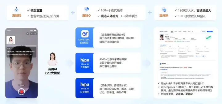 ·AI面试量最大:海纳AI服务了5000多家企业客户,其中包括100多家500强集团,累计面试超1200万人次,在快递、制造、零售、餐饮等行业沉淀了1000+岗位模型。