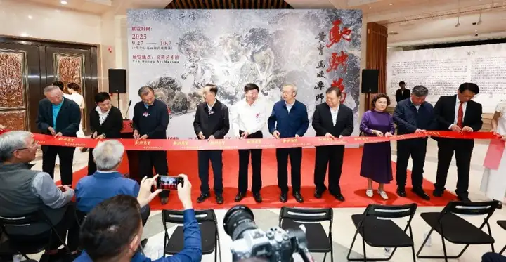 开幕式的最后,贾春旺、何毅亭、文宏武、散襄军、陈卫东、任正黎、朱彤、连辑、王书平、梁缨、马欣乐一起为开幕式剪彩,共同见证“驰骋万里—黄胄马欣乐师生画展”的开启仪式。
