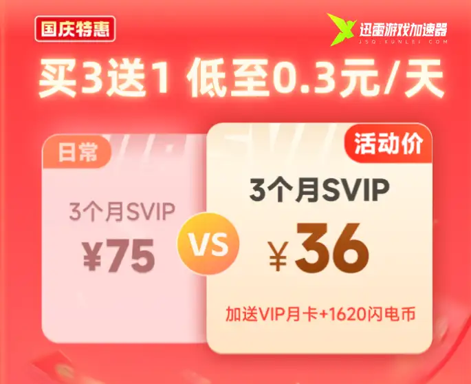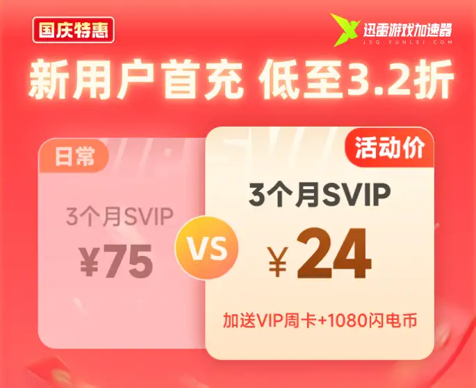 为了让更多玩家以最佳的网络状态迎接假期,迅雷游戏加速器特别推出国庆专属福利:9月28日至10月14日,限时活动正式开启!活动期间,季卡首充低至3.2折,更额外加赠周卡或月卡惊喜——原本只够买一张月卡的预算,现在在迅雷游戏加速器就能直接畅享3个月电竞级专线加速!