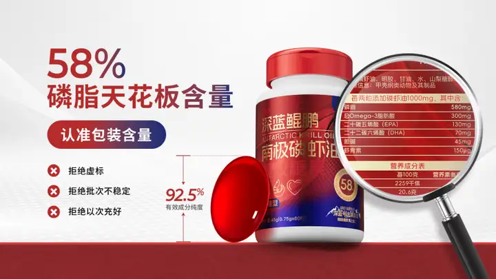 很多品牌只敢模糊宣称 “含磷脂”,却从不标注具体数值,背后往往是磷脂含量不足(市面多数产品低于40%)、甚至掺假的猫腻,来以次充好;而优质磷虾油会把磷脂含量清晰印在包装上,让消费者“看得见、算得清”。比如深蓝鲲鹏南极磷虾油,直接在包装上标注58%磷脂:一方面,这个数值远超市面平均水平,是实打实的高纯度营养;另一方面,公开标注也是对“不虚标、不掺假”的承诺,避免消费者花高价买“低营养”。