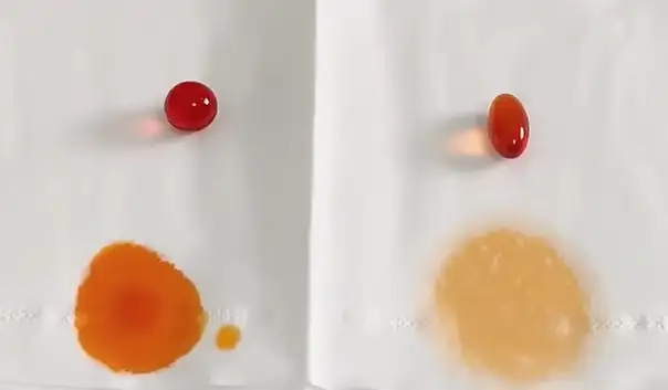 优质磷虾油因含高纯度磷脂(通常≥50%),质地会偏粘稠,滴在纸上能聚成小团,不易扩散;而劣质或低纯度磷虾油,磷脂含量低、杂质多,滴在纸上会快速晕开,甚至出现油斑分层。