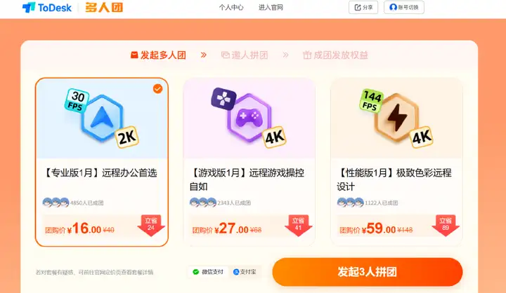 ToDesk远程控制服务推出重磅拼团活动,让高效远程连接变得更加触手可及。新人两人即可成团,非新人也仅需三人组团,即可享受专业版、游戏版、性能版三大版本的四折超值优惠!