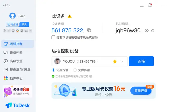 针对远控非团队版用户,ToDesk特别推出多通道年包和月包限时8折优惠。多通道功能让您能够同时连接多个设备,实现真正的高效多任务处理,比如一边远程控制办公室电脑处理工作,一边连接家中电脑传输文件,还能同时查看另一台设备上的监控画面。