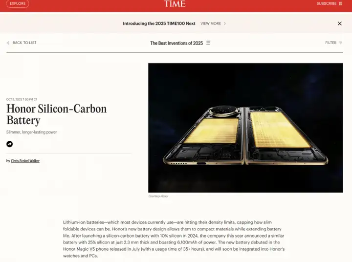 《时代周刊》“最佳发明”榜单素有“科技创新界奥斯卡”之称,被视为全球科创领域的风向标。2025年苹果、英伟达、Meta等企业的顶尖产品均榜上有名,往年华为三折叠,谷歌大模型等行业突破性发明也出自该榜。此次荣耀双项入选,既体现其在电池与AI安全领域的技术成果,也将为后续相关领域的创新探索与实践注入更多动能,即将发布的荣耀Magic 8,想必也会延续这份创新基因,带来更多惊喜。