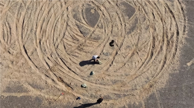 当时戈壁滩无明显地物特征,初教机导航设备简陋,空军飞行员用经纬仪定位、皮尺丈量,以木棍勾勒轮廓,铁锹挖开戈壁石露出碱土,为飞行员指引空域航向,见证着戍边官兵的奉献。