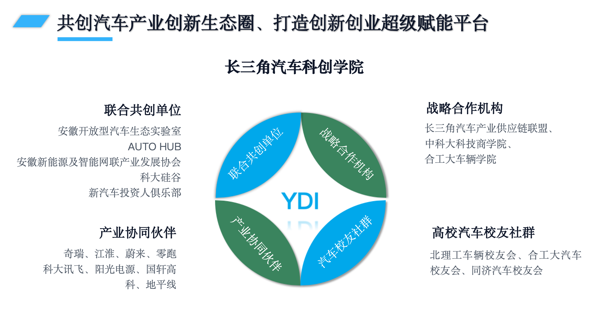 学院创始人王丰斌表示,长三角汽车科创学院立足安徽、辐射长三角,充分发挥共创机构资源优势,全力打造汽车产业强大资源协作生态圈。同时,并汇聚近百位产业领军人物、顶尖学者和资深投资人组成的导师团队,打造覆盖创业全周期的课程体系,通过行业研究、场景化实训、产业链接、超级路演、榜单发布等特色活动,致力于成为汽车产业高端创新创业服务领域的标杆,成为汽车科创策源地。