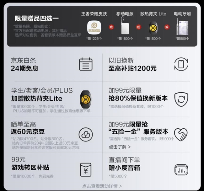 来京东预约iQOO 15,0元预约抽新机,9.9元锁定价值299元的TWS A4耳机和总价值427元的保修服务全家桶,全家桶包含价值129元的一年延保、价值159元的三年电池宝和价值139元的一年后盖宝。此外,来京东下单iQOO 15,还可享24期免息、以旧换新至高补贴1200元、学生/老客/会员/PLUS限量加赠散热背夹Lite、晒单至高返60元京豆、限量99元游戏转区补贴、碎屏保买一年送一年、赠至高1000元新机互联网权益、直播间下单限量赠小度音箱等福利,发布当天下单还可享加99元限量抢80%保值换新版本、加99元限量抢“五险一金”服务版本(含7天无理由、30天无忧换新、90天意外换新、180天只换不修、一年碎屏宝、2年质保、3年电池保的五险保障和200元复购补贴的一金保值)。