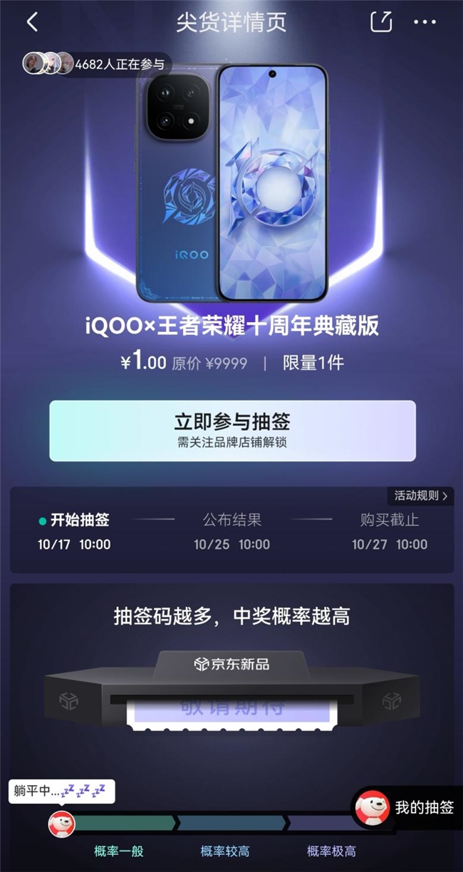 值得一提的是,京东还推出了iQOO×王者荣耀十周年典藏版抽签活动,中签可1元购该款新机。消费者在京东首页访问“新品”频道,在“新品权益”中点击“尖货抽奖”,下拉寻找iQOO×王者荣耀十周年典藏版抽签,即可进入页面。即日起,消费者可参与抽签,还可完成任务提高中签概率,中签结果将在10月25日10点公布,中签消费者需在10月27日10点前完成购买。