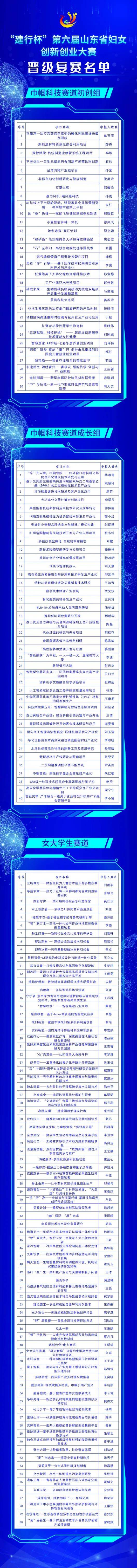 晋级复赛名单如下,大赛官网同步公布(“建行杯”第六届山东省妇女创新创业大赛官网地址:https://sdsfncxcyds.newchuangye.com)。