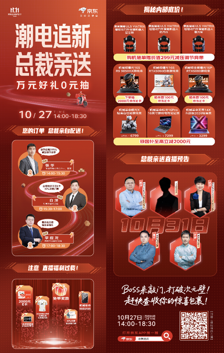 10月27日,一场别开生面的直播活动即将刷新消费者的购物体验。在当天14:00至18:30,京东3C数码采销直播间将以“潮电追新,总裁亲送”为主题,开启“总裁送货”直播。直播期间,傲鲨、机械师、机械革命等总裁将亲自化身“快递小哥”,为实时下单的幸运用户上门派送爆款新品,为消费者带来一场集科技、互动与福利于一体的沉浸式直播大秀。打开京东APP搜索“总裁送货”或扫描活动海报二维码就能直击总裁送货现场。