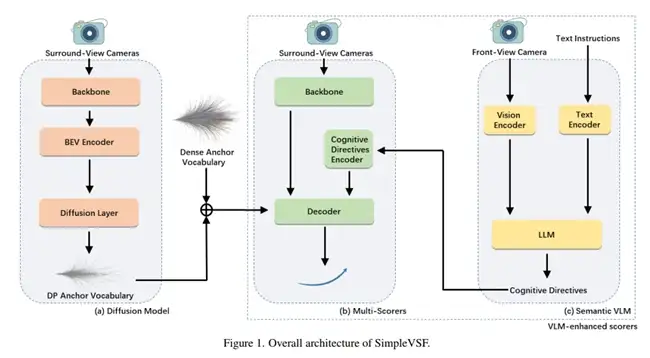 该框架采用扩散模型生成高质量的多样化候选轨迹,奠定规划基础;运用ViT-L等先进视觉骨干网络进行高效、鲁棒的环境特征提取,为下游任务提供可靠表征;并引入Qwen2.5VL系列视觉语言模型,利用其在场景理解与指令生成方面的语义优势,确保系统整体性能基础的坚实与领先。