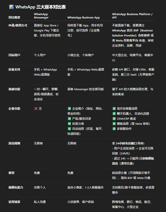 这些问题的根源在于对WhatsApp产品体系的理解不足。实际上,WhatsApp提供三种不同版本,各版本的功能特性和商业用途存在显著差异。