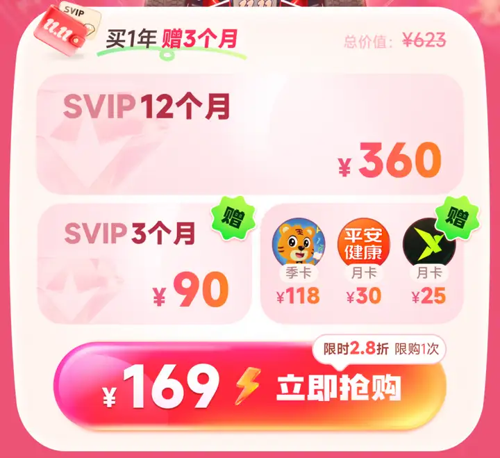 SVIP双年卡套餐:买1得5,加赠6个月超级会员及额外4项实用权益
