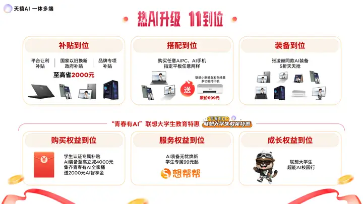 面对大学生群体,联想此次也特别规划了精准的“到位”支持。在核心的购买权益层面,学生凭有效认证可在多重补贴基础上再享专属教育优惠,部分机型累计最高优惠达4000元。值得一提的是“青春有AI全家桶”套装,学生用户只要同时购齐AI PC、AI平板与AI手机三款核心设备,即可额外获得2000元“智享金”。这笔资金可自由兑换平台内丰富的软件、服务与周边产品,全面覆盖AI学习、AI生活与AI娱乐三大维度,真正实现了对大学生校园全场景需求的精准支持与个性化满足。与此同时,联想也同步优化了服务权益与成长权益,提供99元起的保值换新服务,并将携手AI导师开展校园活动,将前沿的智能体验和AI装备直接带到学生身边。