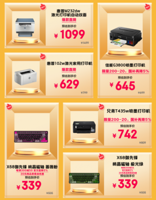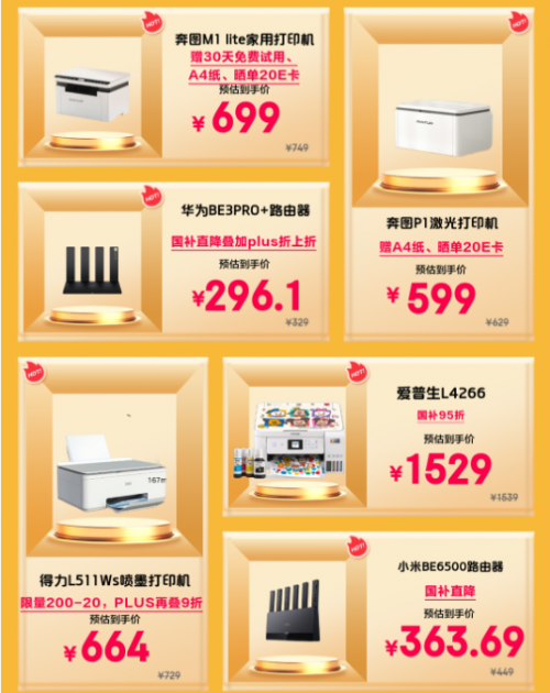 打印设备同样满足企业、家庭等多场景的多样化打印需求。爱普生L4266墨仓式彩色打印机,打印成本极低,国补后1529元;得力L511Ws喷墨打印机,小巧便携,打印清晰,限量满减+PLUS折扣后664元;奔图P1激光打印机,高速打印,稳定可靠,599元入手还赠A4纸与E卡;佳能G3800喷墨打印机,色彩鲜艳,打印清晰,到手价645元,满足家庭照片和文档打印需求;兄弟T435w喷墨打印机,操作便捷,到手价742元;惠普M232dw激光打印机,自动双面更省纸,爆款直降到手价1099元。此外,汉印Z1照片打印机到手价839元,富士小俏印二代到手价889元,都是家庭打印照片的好帮手。