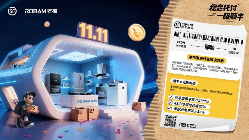 在传统运营模式下,老板电器面临家居家电行业的共性痛点,为突破瓶颈,老板电器与顺丰合作启动供应链变革计划。顺丰提供从采购到售后的端到端解决方案,从规划、策略到履约实现全维度赋能,助力老板电器信息准确率升至99%,48小时履约率稳定在95%以上,助力企业从“传统制造”迈向“敏捷供应链驱动”。
